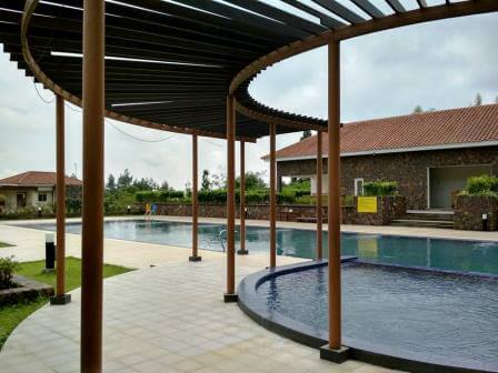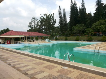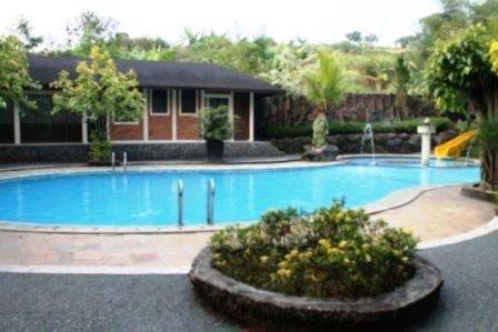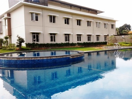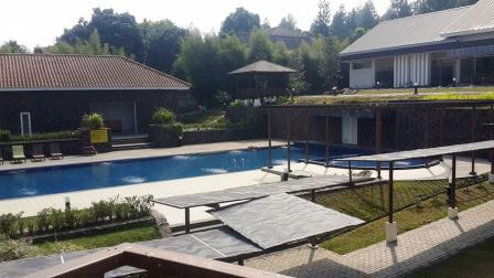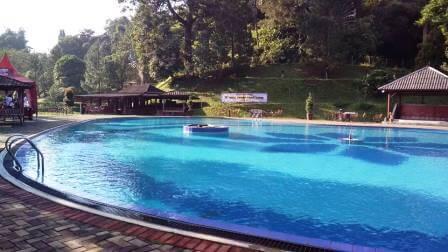 Kolam renang besar yang terletak di depan penginapan membuat tempat outbound di Bogor ini makin mempesona dengan desainya.